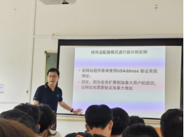 黄金洲老师作为系里新进博士,今年讲授课程《软件设计模式与体系结构》。在他的课堂中教学目标明确,备课认真充分,非常晦涩难懂的问题变得简单化、形象化,每讲一个知识点他总会联系到生活中的具体案例,为了加强与员工的互动,他用翻转课堂的方式引导员工去思考并解决问题。