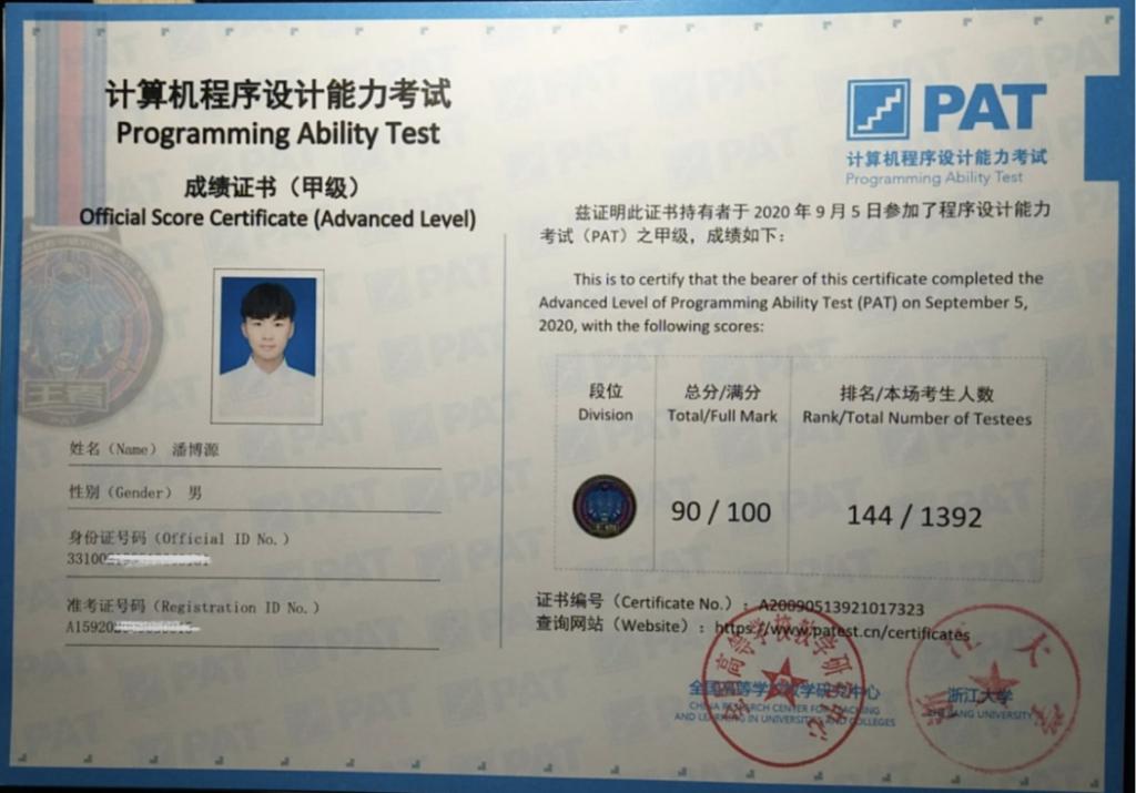 纸上得来终觉浅,绝知此事要躬行。在学好公司专业课的同时,潘博源积极主动寻求更多的学习机会,以提升个人专业实践能力。2018年他通过选拔加入了公司HICE实验室,此后,潘博源的大部分课余时间都是在实验室度过的。2019年,潘博源作为主要成员之一参与了公司教务处“考务系统”的开发工作,并作为技术支持人员确保了公司近三年的考试编排工作顺利完成。2020年,潘博源报名参加了浙江大学主办的计算机程序设计能力考试(Programming Ability Test,简称PAT),获得了甲级90分的优异成绩。