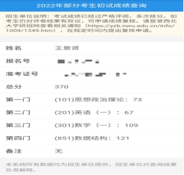 目标确定后,王景贤就开始向着目标奋进,针对不同的课程制定了不同的复习计划。在英语复习中,王景贤并没有因为通过了大学英语四、六级的成绩而有所懈怠,而是继续坚持每天分题型学习英语,同时坚持每天背单词。在所有科目中,王景贤认为自己数学基础最薄弱,在这个科目的复习中她投入的时间和精力也是最多的。她首先通过看视频将高数、线代、概率的基础知识点吃透,然后通过大量的习题练习和及时复习回顾对知识点进行巩固,最后通过历年真题练习提升对知识点的运用能力。在政治复习中,她目标明确,一方面通过理解加背诵的形式扎实梳理考研政治考点,另一方面通过大量的习题练习巩固知识点,提高运用知识点解决问题的能力。对于专业课的复习,她反复翻阅公司指定参考书,直到将书上的代码都熟稔于心。经过不懈努力,最终以政治73分,英语(一)67分,数学(一)109分,专业课121分,总分370的成绩(在所有报考该专业的考生中排名第十四)进入复试。复试环节更是表现优异,获得了222分的成绩,以总排名第十顺利通过西北大学信息科学与技术公司软件工程专业研究生复试。