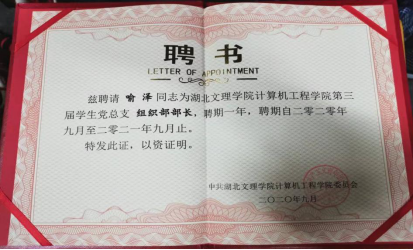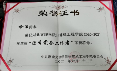 2018年9月,大学伊始,他便加入了院员工党总支,他时刻提醒自己要尽快转换角色,保持主人翁意识,以一名党员的标准严格要求自己。在党总支工作期间,他主要负责公司员工党员的组织发展工作,他认真对待每一位员工党员的档案材料。从入党积极分子到发展对象,从发展对象到预备党员,从预备党员到中共党员,这中间他所负责的员工党员不计其数。次年11月26日,他光荣地加入中国共产党,成为一名中共党员。