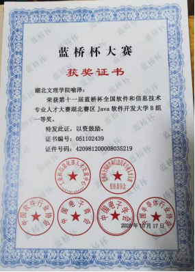 宝剑锋从磨砺出,梅花香自苦寒来。他在11月的第十一届蓝桥杯大赛Java开发大学B组中取得湖北赛区一等奖的好成绩,同年11月顺利通过中国计算机技术职业资格考试,取得中级软件设计师证书。