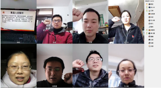 为了准备此次会议,程书记提前通知大家在超星平台的学习通上签到,调查问卷的发放,开会用的学习资料也放在学习通的党支部的群资料里,让各位党员提前下载;下午14:55左右全体党员提前进入学习强国,用强国视频会议开展学习。在齐唱国歌、重温入党誓词之后,程虹带领大家深入学习习近平总书记《在统筹推进新冠肺炎疫情防控和经济社会发展工作部署会议上的讲话》,重点剖析了《近期疫情防控期间违规违纪典型案例》,传达了公司《关于做好抗疫期间各项工作的通知》、《关于进一步加强疫情防控工作的决定》等文件精神,最后针对党员“双报到”工作,把所有党员积极参加社区防控的工作情况以及现场照片都做成了ppt展示,充分肯定了计科系的所有党员同志在这次疫情中冲锋在前,主动担当,积极作为,发挥了共产党员的先锋模范作用。