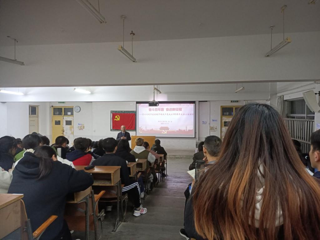 徐超以“奋斗百年路,奋进新征程”为主题,向同学们讲述了中国共产党的百年奋进历程,他用“浴血奋战,百折不挠;自力更生,发愤图强;解放思想,锐意进取;自信自强,守正创新”32字概括了中国共产党的百年历程,向同学们诠释了“红色政权怎么来的、新中国怎么来的、今天的幸福生活怎么来的”三个问题。随后徐超带领同学们观看了《觉醒年代》相关片段,让同学们认识到今天的幸福生活来之不易,鼓励同学们要发愤图强。接着他讲述了“伟大斗争,伟大工程,伟大事业,伟大梦想”,它们紧密联系、相互贯通、相互作用,在坚持和发展中国特色社会主义的历史进程中始终成为坚强领导核心。最后,徐超总结了新中国取得的成就以及当前严峻的中美关系,鼓励同学们要努力奋斗、刻苦钻研、志存高远、勇做时代的弄潮儿。